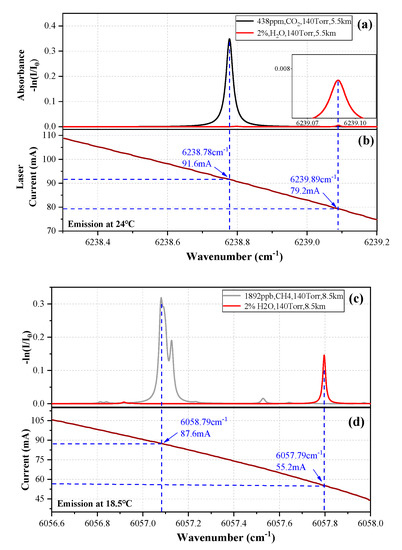 The 1603.2 nm DFB laser (NEL, NLK1L5EAAA, Oslo, Norway) and the 1651 nm DFB laser (NEL, NLK1U5FAAA) were placed on the “Dual-channel collimator” cage plate and were used to detect the CO2 and CH4 concentration, respectively. According to the above method, the optical path lengths of the cavity are 5.5 km (@1603 nm, CO2) and 8.5 km (@1651 nm, CH4), so three transmission spectra of 438.6 ppm CO2, 1892.2 ppb CH4 and 2% H2O in the spectral region from 6238.3 to 6239.2 cm−1 and 6056.8 to 6058 cm−1, respectively, were simulated using the HITRAN 2016 database. As shown in Figure 2a, the absorption line located at 6238.78 cm−1 for high-precision detection of CO2 was selected due to its large absorption strength of 1.75 × 10−23 cm/molecule at a temperature of 296 K. Furthermore, its absorbance can be up to two orders of magnitude higher than the red line of 2% H2O (line strength, 1.23 × 10−26 cm/molecule) in the nearby waveband. The CH4 absorption lines (three overlapping lines) near 6057.09 cm−1, whose full strength is 3.25 × 10−21 cm/molecule at a temperature of 296 K, are plotted in Figure 2c. Their distance from the red line of H2O (wavenumber, 6057.796 cm−1) is 0.705 cm−1. At the same time, the linear relationship between the lasers emitting wavenumber and driving current is shown in Figure 2b,d, the current range was decided to be 75−110 mA to scan the CO2 line, and the range was decided to be 44−105 mA to simultaneously scan CH4 lines (three overlapping lines) and H2O lines.