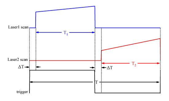 In order to achieve the purpose of simultaneous detection, a time-division multiplexing method was proposed. Figure 3 shows the scanning signal of two lasers and time sequence of the system. On a scan periodicity T, T1 is the scanning range of the laser1 and T2 is the scanning range of the laser2, which cover the absorption line of CO2 and the absorption line of CH4, respectively. “T2+ΔT” is a direct current output of laser1 and “T1+ΔT” is a direct current output of laser2, which ensure each scanning range of the lasers was staggered without interference. In this way, the laser beams can be simultaneously coupled into the cavity and acquired by the photodetector. Figure 4 depicts the time-division multiplexing method which is used to detect the actual output signals of the photodetector. As shown in Figure 4, the method can be perfectly applied to the dual-laser OA-ICOS sensor without the problem of superposition of laser intensity.