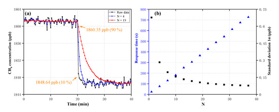 Figure 5a shows the concentration of two standard CH4 gases (1847.2 ppb and 1861.6 ppb) over a time period of ~40 min, with a measurement interval of 20 s. The concentration inversion method for determining the concentration has been given in Section 3.2. The blue triangle curve and the red circular curve represent the filtered concentration of N = 4 and N = 19, respectively. Response time is determined by the concentration decreasing from 1860.35 ppb to 1848.64 ppb (orange rectangular area), which is 90% and 10% of the difference between the two concentrations, respectively. Figure 5b shows the relationship between N versus the standard deviation of the measurement of 1861.6 ppb CH4 gas (black curve) and the sensor’s response time (blue curve). It can be seen that the standard deviation decreases exponentially with increased N, and the response time increases linearly with increased N, meanwhile, for the OA-ICOS sensor, a value of N = 10 (a quarter of the standard deviation of the raw concentration) was chosen as a compromise between the fast temporal response and the high filtering efficiency. Note that the different concentrations’ standard deviations and the different response time, affect the selection of N, thus the experimental conditions were needed to analyze specifically.