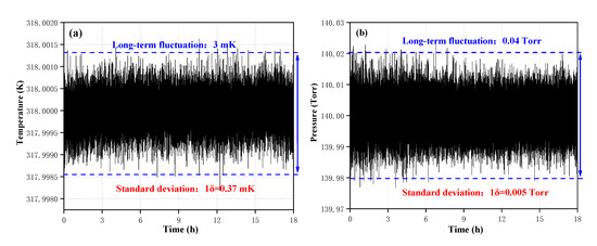In the practical atmospheric measurement, ambient air has a large temperature difference between day and night, such broad temperature changes have a significant impact on the line-strength of the absorption line. In addition, pressure changes also have a significant impact on the linewidth of the absorption line. Therefore, for high precision optical detection, it is necessary to ensure a constant temperature and constant pressure. The data for the target temperature in the cavity stabilized at 318 K (45 °C) and the target pressure stabilized at 140 Torr; recorded in the room-temperature laboratory, with a measurement interval of 1s. Over an 18 h period of continuous measurement, without additional calibration, the standard deviation 1σ was 0.37 mK, the long-term fluctuation value of the temperature was 3 mK and plotted in Figure 6a. The gas-flow of 100 sccm, controlled by a precision gas flow-meter (Beijng Sevenstar Flow Co., Ltd. D07-19B, Beijing, China), at the gas-inlet of the sensor by the gas flow-meter to ensure stable gas. As shown in Figure 6b, the standard deviation 1δ was 0.005 Torr, and the long-term fluctuation value of the pressure was 0.04 Torr.