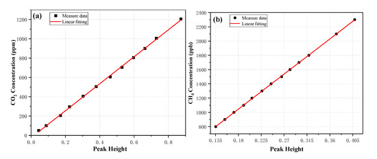 The dual-laser OA-ICOS sensor was used for the quantitative detections of CO2 and CH4 concentrations. Twelve CO2 samples with a concentration range of 50−1200 ppm were prepared by a gas mixing system (Environics. Inc, Series 4000) via diluting a standard 2000 ppm CO2 with pure nitrogen N2. By using the same gas mixing system, thirteen CH4 samples with a concentration range of 800−2300 ppb were prepared via diluting a standard 2300 ppb CH4 with pure nitrogen N2. In order to ensure that the pressure and temperature in the calibration are consistent with the pressure and temperature in the practical atmospheric measurement, the target pressure and target temperature in the optical cavity were also controlled at 140 Torr, and 45 °C, respectively. The X-axis is the peak height from the spectral fit and the Y-axis is the expected concentration.
