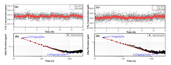 (a) The long-term concentration measurement of CO2 and its EMA algorithm result. (b) Allan deviation analysis of the CO2 data. (c) The long-term concentration measurement of CH4 and its EMA algorithm result. (d) Allan deviation analysis of the CH4 data.