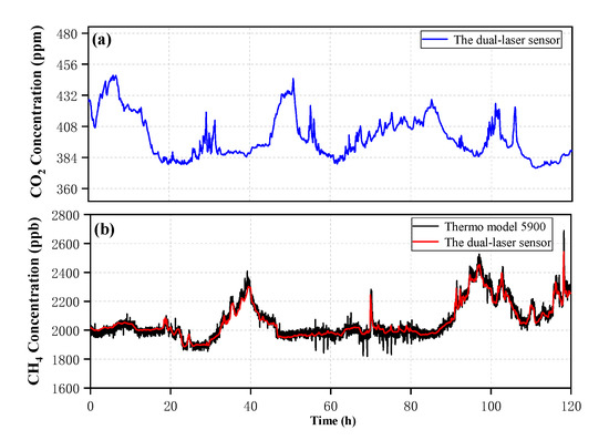 Figure 9 depicts the performance of the dual-laser OA-ICOS sensor that is demonstrated with gas concentration measurements in ambient air. A commercial instrument (Thermo Scientific model 5900) was applied to ambient air measurements as well for side-by-side intercomparison. This instrument mainly uses meteorological chromatography technology to detect methane and non-methane total hydrocarbons, so unfortunately, it is impossible to compare the results of carbon dioxide detection. The entire measurements were performed over a time period of ~120 h with a measurement interval of ~120 s. Furthermore, these two instruments were used in a designated meteorological station located in Zibo City, Shandong Province, China. The black solid line represents the CH4 concentration result detected by the commercial instrument, and the red solid line represents the CH4 concentration detected by the dual-laser sensor. The measurement trends of the two instruments are well consistent for the 120 h measurement time. It is proved that the dual-laser sensor has a practical engineering value for the ambient air measurement of gas concentration.