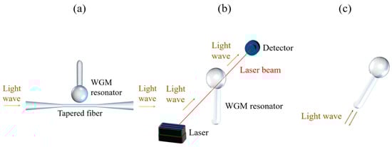 Schematics of the signal detection system of whispering gallery mode (WGM) microresonator. (a) Sketch of an optical WGM microresonator coupled to a tapered fiber [24], where the input light was guided inside the tapered fiber from one end, and the resulting signal was detected at another end. (b) WGM biosensor platform, where input optics guided the light beam through the resonator, which was then detected at output optics [25]. (c) The detection system presented in this work was based on input light being guided inside the ball resonator, and the resulting back-reflected output signal was detected.