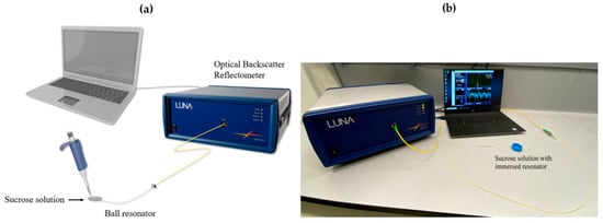 In the proposed work, we presented fiber ball resonators for RI sensing, with diameters around 500 µm, fabricated on an SMF fiber. Due to low reflectivity, the spectra of ball resonators were detected with an optical backscatter reflectometer (OBR), suited for detecting weak spectra with picometer-scale resolution; the schematics of the detection system presented in this work vs. the work of our colleagues is shown in Figure 1.