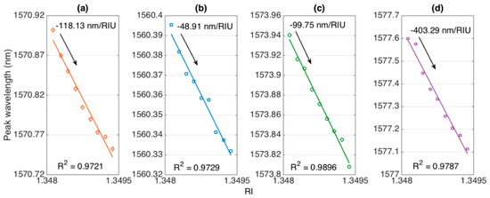 Figure 6 shows wavelength sensitivity for each sensor, reporting the peak wavelength estimated with the centroid algorithm for different RI values (on a 1.24 × 10−3 interval). For all sensors, we observed a linear response, where peak wavelength decreased with RI increase. The sensitivity was measured with linear regression, reporting the coefficient of determination R2. For all sensors, a very linear trend was observed, with R2 > 0.97. Sensitivity values were estimated as −118.13 nm/RIU (547 μm), −48.91 nm/RIU (532 μm), −99.75 nm/RIU (494 μm), and −403.29 nm/RIU (466 μm); the last value appeared higher, partly due to the different shape of the interrogated spectral feature.