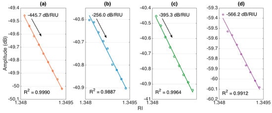 Similarly, Figure 7 shows amplitude sensitivity estimated for each sensor on the same RI interval. Again, we observed a linear trend (R2 about 0.99 for all sensors), with intensity reducing as a function of RI for all interrogated spectral features. The estimated sensitivity figures were −445.7 dB/RIU (547 μm), −256.0 nm/RIU (532 μm), −395.3 nm/RIU (494 μm), and −566.2 nm/RIU (466 μm), respectively.