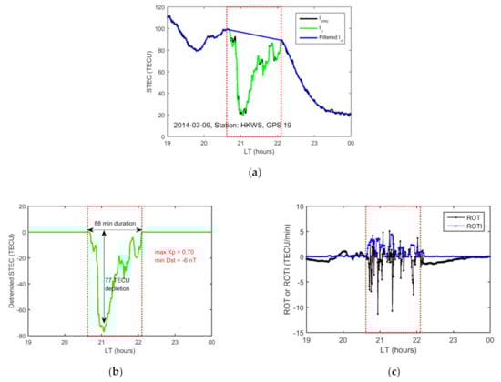 15]. The occurrence rate, time duration, and depth of TEC depletions and their dependence on the LT and season from 2002 to 2014 were analyzed at the global scale [