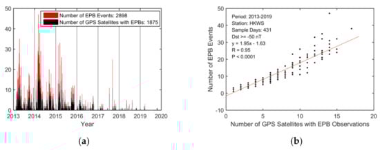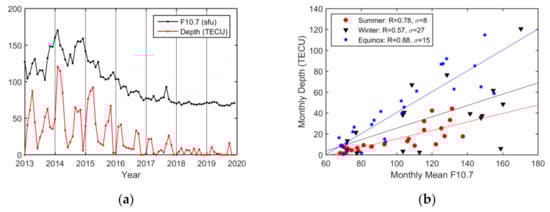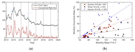 19] indicated that the EPB occurrence rate varied with solar activity from 2001 to 2012 and reached a maximum during the high solar activity year of 2002. They reported that the correlation coefficient between the annual total number of EPB occurrences and the annual mean F10.7 index was 0.92. Moreover, they observed that the effects of solar activity on EPB occurrences were more pronounced on an annual basis than on a monthly basis. They found that the annual correlation coefficient of 0.92 between the annual number of EPB occurrences and the annual mean F10.7 index was significantly larger than the monthly correlation coefficient of 0.63 between the monthly occurrences and the monthly mean F10.7 index. For the seasonal impacts of solar activity on the number of EPB occurrences, their seasonal analysis showed that EPB occurrences were influenced more during spring and autumn (R = 0.80) than during summer (R = 0.62) and winter (R = 0.68).
