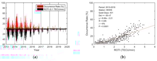 17] reported that the seasonal occurrence rate was significantly larger in the two equinoctial seasons than in the solstitial seasons in 2014 and 2015. In the low solar activity year of 2017, the difference in the occurrence rate between summer and the two equinoctial seasons was not obvious. The correlation coefficients between the ROTIs and scintillation indices over Hong Kong from 2012 to 2013 were found to be 0.6 if the data from all GPS satellites were used together [