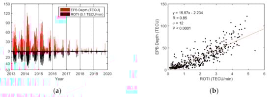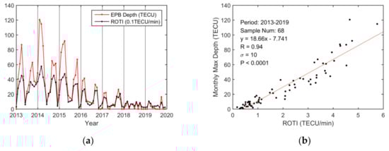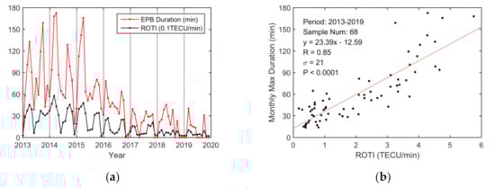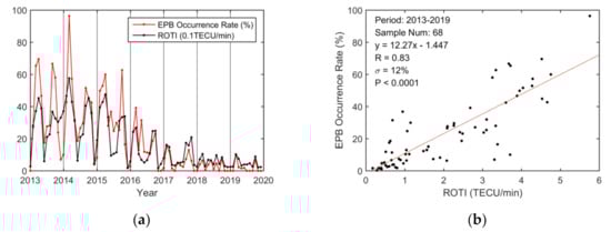 13]. The relationship between the three EPB parameters and the ROTIs reflects the degree of correlation between electron density depletions and density irregularities. The significant correlation coefficients indicate that greater value in the ROTI is usually closely associated with larger occurrence rate, depth, and duration of EPBs.