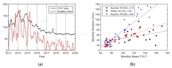 Furthermore, the seasonal impacts of solar activity on EPB occurrence, depth, and duration indicated that the impacts of solar activity were most pronounced in the equinoctial months than during winter. Moreover, the differences on impact degree of solar activity were compared respectively between annual and monthly bases for EPB occurrences (annual R = 0.96 vs. monthly R = 0.59), depths (annual R = 0.94 vs. monthly R = 0.68), and durations basis (annual R = 0.95 vs. monthly R = 0.63). The results show that EPBs are influenced more obviously on an annual basis than on a monthly basis.