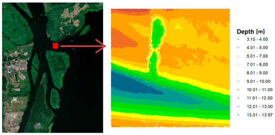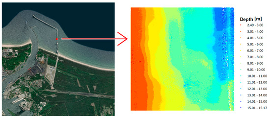 Both research areas are located in Poland. The first test area is located in the Baltic Sea and is part of the newly established LNG port in Swinoujscie. The range of the area under study was 100 m × 100 m. The test dataset included a total of 2,670,450 measuring points. The minimum depth in the studied area is 2.49 m, maximum depth is 15.17 m, and mean depth is 7.30 m. The range of spatial data with depth visualization is presented in Figure 1.