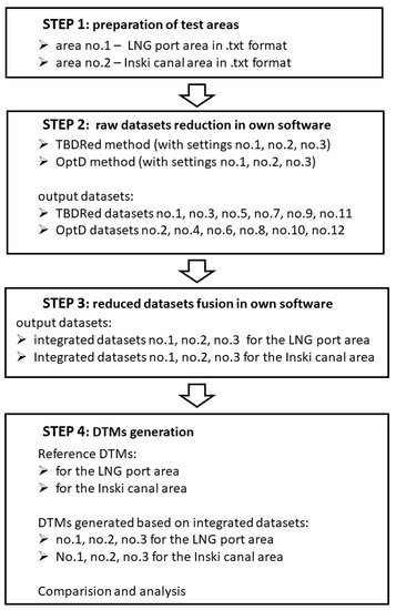 In the next step, the authors compared the resulting sets. The comparison was based on statistical and visual analysis. The last step carried out during the research was the fusion of bathymetric data obtained by the two proposed methods. The result was six data sets after reduction: three sets for the LNG port area and three sets for the Inski canal area. The main research methodology is schematically presented in Figure 3.