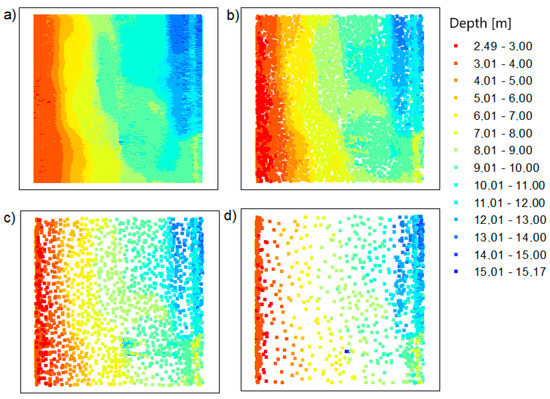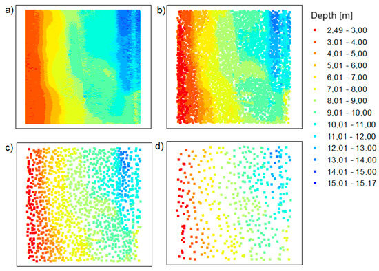 The points based on the Inski canal area: (a) raw data; (b) dataset reduced with the OptD method for setting no. 1; (c) dataset reduced with the OptD method for setting no. 2; (d) dataset reduced with the OptD method for setting no. 3.