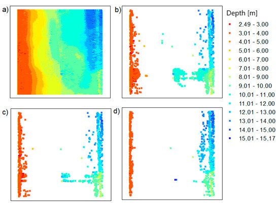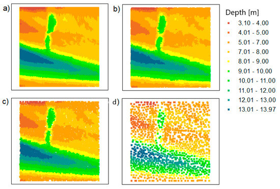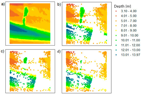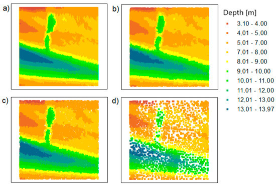 The points based on the Inski canal area: (a) raw data; (b) dataset reduced with the TBDRed method for setting no. 1; (c) dataset reduced with the TBDRed method for setting no. 2; (d) dataset reduced with the TBDRed method for setting no. 3.