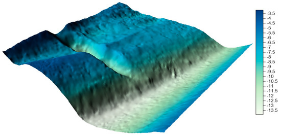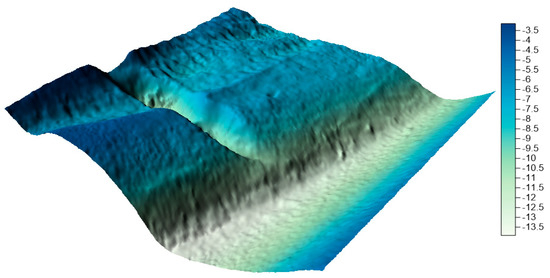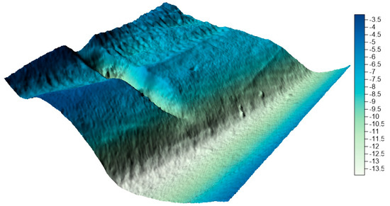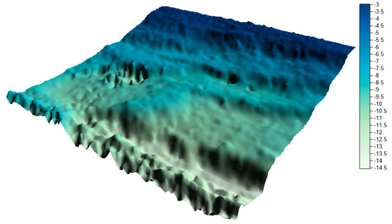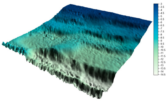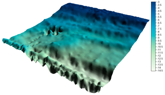 In the next step, on the basis of all collections, numerical bottom models were generated and compared with the reference surface. In his study, Malejka [24,25] showed that, only taking into account the accuracy of the numerical bottom model, the best interpolation method for data is Kriging. The authors decided to create a reference surface using this method and to apply the mesh size of 1 m. This is a standard resolution used by hydrographic offices all over the world when creating numerical bottom models. The visualization of the reference surface for the LNG port area is shown in Figure 10.
