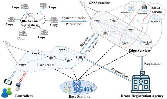 The security of drone network services is also an issue that should be taken into consideration because there will be a large amount of data exchange and data storage requirements during the drone flying automation process. If some sensitive or important data cannot be well protected, it will cause various potential security threats such as privacy leaks and compromised data integrity []. However, as many untrusted third-party cloud service providers join the drone network to provide edge services, the drone network service environment will become complex and unreliable. For example, some malicious behaviors may occur, including collecting user privacy information and tampering with user data. Therefore, some secure privacy and data integrity protection mechanisms need to be introduced into the drone network. Fortunately, blockchain technology provides feasible solutions to these issues [,,], since it provides a reliable consensus in a distrusted environment without trust. Especially in [], the authors present a blockchain-based security scheme in 5G drone networks to ensure privacy preservation during communications between drones, which demonstrates the feasibility of leveraging blockchain to facilitate privacy preservation in the drone network. Because of its anonymity, encryption, traceability, and non-tamperability, blockchain can provide good protection for user privacy security and data integrity. However, traditional blockchains such as Bitcoin [] and Ethereum [] are limited by the throughput and hardware resources of devices due to their proof-of-work (PoW) or proof-of-stake (PoS) consensus mechanisms. They are not suitable for IoT. Therefore, blockchain based on the new consensus mechanism of directed acyclic graph (DAG) is born. The DAG-based blockchain has also been proved to be better for IoT than the traditional blockchains [,]. The authors in [] also show that blockchain can be used to ensure secure edge services under complex industrial networks.