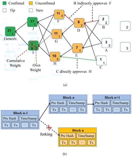 DAG-based blockchains such as Tangle [] aim to improve the performance of traditional blockchains by applying a new data structure and consensus mechanism. As shown in Figure 2, the data structure of Tangle is based on a directed acyclic graph, while traditional blockchain is based on a linked list. The main difference between the blockchains with these two data structures is whether they allow forking. In the Linked-list based blockchain, forking is not allowed. It happens when multiple blocks are generated in the same block generation cycle, and only one block will be written into the blockchain as an effective block. However, in the DAG-based blockchain, forking is allowed, which enables DAG-based blockchain to process transactions in parallel, greatly improving the throughput. It is well known that Bitcoin’s transaction throughput is 7 TPS and Ethereum’s is 20 to 30 TPS []. An efficient and compacted DAG-based blockchain protocol (CoDAG) proposed in [] shows that CoDAG achieves a throughput 164 times that of Bitcoin’s and 77 times that of Ethererum’s throughput, respectively. When it comes to the consensus mechanism, traditional blockchains are usually based on the PoW or PoS. Blockchain nodes reach consensus through competition of computing power or stake, which results in higher requirements on the equipment performance of nodes. However, in DAG-based blockchains, the newly generated transaction only needs to select two tips to verify, then add the hashes of these two tips to the unit of this transaction to approve. There is no competition but mutual supervision in DAG-based blockchains.