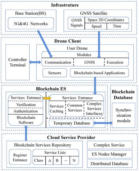 Cloud Service Provider (CSP): CSP refers to various third-party cloud service providers. Their main function is to create a variety of drone network services. After creating new services, they pack these services as service plugins and upload them to the service repository for registration and sharing. Some complex services that consume a large amount of computing and storage resources are provided directly by CSPs, and only the interfaces are registered to the service repository. For the storage of some data of user drones, the distributed database is well deployed in this part. Furthermore, since most drones in Blockchain ES (explained later) are provided by CSPs, this part also provides an ES node manager to manage and maintain these drones.
