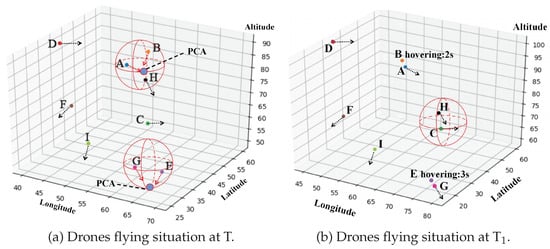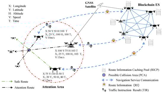 Figure 6a,b shows the drone flying situations at two moments T and T during a simulation. At time T, Blockchain ES detected two Attention Areas, and it was calculated that there were two PCAs between A and B, E, and G. Then, Blockchain ES sent different TIRs to A, B, E, and G respectively. After receiving TIRs, each user drone took a different flying action according to TIRs at time T. For example, B and E hovered in the air to wait for A and G flying through involved PCAs, then continued to fly along the original routes. At the same time, although Blockchain ES detected that the relative spatial position of C and H entered into an Attention Area, it was found that PCA did not exist after analyzing their RIs.