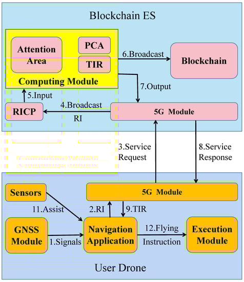 - Privacy ProtectionThe blockchain uses asymmetric encryption methods to protect data privacy. When user drones need to exchange data, they can use the recipient’s public key to encrypt the data. For some important data that needs to be stored in the CSP’s distributed database, user drones can also use their own public keys for encryption and then send the encrypted data to Blockchain ES. In addition, because the public key does not contain any user information, using the public key as the identity and communication address of the user drones can meet the anonymity requirement and thus protect the user’s identity privacy.
