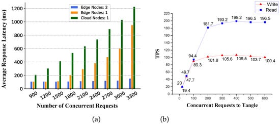 (2) TPS of Tangle: Because our architecture uses DAG-based blockchain, in order to verify that the performance of this form of blockchain is indeed better than Bitcoin and Ethereum, we conducted high-concurrency read and write tests on a single node in the Tangle network. The experimental results shown in Figure 7b show that, under the current configurations, the maximum numbers of read and write transactions per second for a single Tangle node were about 102 and 196, respectively, which are much higher than the throughput of Bitcoin and Ethereum. By increasing the number of nodes or improving hardware performance, the overall read-write speed of the Tangle network can be further improved.