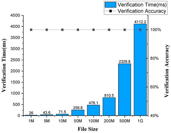 (3) Data Integrity Verification: As an important technology to ensure security of SDNES, one of the core functions of blockchain is to ensure the integrity of data generated by user drones, so as to effectively prevent data from being maliciously modified. This function is very useful for safe storage of drone files or data. In order to test the performance of data integrity verification, we verified the integrity of files of different sizes from 1M to 1G. Specifically, we randomly generated eight types of files of different sizes, as shown in Figure 8. Each type of file contained 100 files with the same size. First, we calculated all the file hashes and uploaded them to the blockchain. Then, we made some arbitrary changes to the files in each type and marked the modified files. We then use the data integrity verification service developed based on SDNES to verify the file integrity. The experimental results show that all the modified files could be detected accurately, and all the unmodified files passed the integrity verification. The accuracy of file integrity verification reached 100%. In addition, in the experiment, we also calculated the average verification time for each type of file. The results show that the verification can be completed within 1 s for files within 200M, and only a little more than 4 s for 1G files. This experiment proves that the application of blockchain in our architecture can guarantee data integrity. In addition, blockchain is also effective for privacy protection, which will be explored in our subsequent research.