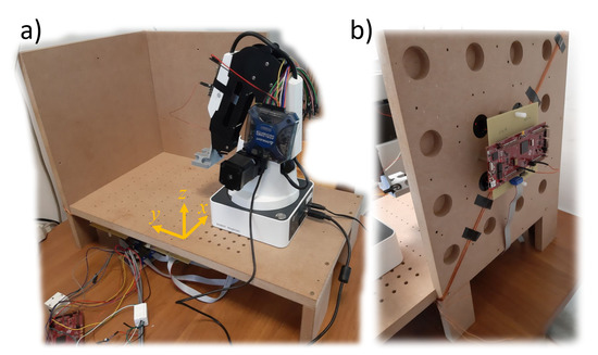 A picture of the system: (a) the whole magnetic positioning system with a robotic arm mounted on it. The reference frame is indicated. (b) A rear view of the plane: the round, carved slots for the receivers are visible; only four receivers are mounted on this plane; signals on the receivers are acquired by a microcontroller unit (the red board in the picture); and the microcontroller is mounted on a custom circuit board (the yellow board) described in Section 2.10. The other four receivers with a microcontroller unit are mounted on the plane; sixteen receivers are mounted under the plane with four microcontrollers. (The diagonal wire was used to wirelessly power the small solenoid (TX) in a different setup not treated in this paper.).