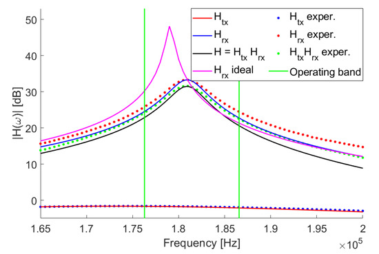 TX is supplied with voltage generated by a waveform generator with an equivalent resistance . The impedance of the TX is easily calculated as . The frequency response is , with the following amplitude: