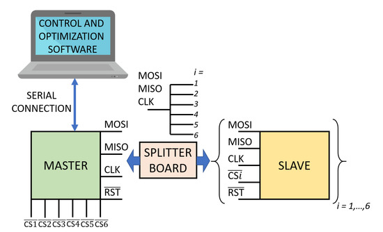 The system is based on two main functional blocks, shown in Figure 5: the distributed DAQ, and the control and optimization software. The distributed DAQ is based on a network of MCUs communicating through a Serial Peripheral Interface (SPI), based on a master–slave architecture. We used a star configuration: the master-out-slave-in (MOSI), master-in-slave-out (MISO), and clock (CLK) lines from the master are split into six lines each, with each branch connected to a slave. There are six slaves. Each slave acquires signals on four RXs and performs the Fourier analysis to estimate voltage amplitudes and phases. The master triggers data acquisition on all slaves simultaneously and then collects all acquired data. There is also a Reset line (RST) to restart all slaves by operating only on the master MCU.The control and optimization software runs on a standard personal computer. This application communicates with the master MCU through a serial connection via the USB port. It triggers the master to start acquisition and then reads all voltage amplitudes and phases stored on the master. These data are used by the optimization routine to estimate the position and attitude of all TXs.