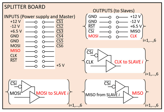 We mounted three-state buffers on the board. We chose TI SN74ABT125 bus drivers since their maximum output current is 32 mA (one of the highest values we found on the market) and their switching time is very short (≈5 ns satisfies the requirements if one considers that our SPI CLK frequency is 3.125 MHz). The output enabled by these buffers is driven by lines of the SPI. The MOSI line from the master is short-circuited to the inputs of six buffers, while each line is used to enable only one buffer at a time. Each buffered output is connected to a different slave. The same scheme has been implemented for the CLK line from the master. In this scheme, each slave is driven exactly by one buffer; hence, the fan-out is not a problem anymore. The scheme is reversed for the MISO lines. The six MISO lines from each of the slaves are connected to the inputs of six buffers, while their outputs are all short-circuited and connected to the MISO pin of the master. In Figure 6, all lines driven by a buffer are indicated in red. The 5 V pin on the input connector is used to power the buffers.