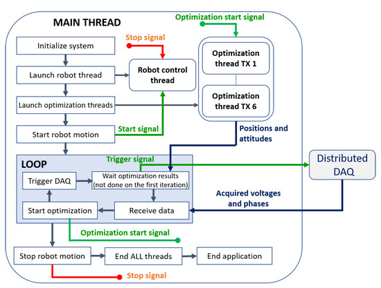 The control software is entirely developed in C++. A simplified flow chart of the software is shown in Figure 7. The robot is controlled by a dedicated thread running independently in order to move the robot and acquire data simultaneously. A predefined set of trajectory points is loaded, the robot thread is started, and then the program enters into its main loop. Through the serial port, the master MCU is triggered (which in turn triggers all slaves), and the application waits until data acquisition has finished and then reads all the voltage amplitudes and phases from the master. The optimization problem is solved by up to six concurrent threads (one for each TX). As in [12], we verified that six concurrent threads are faster than solving six optimization problems sequentially. The next data acquisition on the distributed MCU network is triggered immediately after the optimization threads have been started to perform concurrently both computation and acquisition for faster performances. Once the trajectory is completed (or the acquisition is stopped manually when running in the free hand mode), the main loop terminates. We tested the application on a computer equipped with a six-core Intel i7-8750H CPU at GHz, running Windows 10.