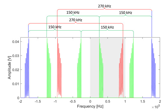 where m is an arbitrary integer indicating how many spectral repetitions there are in the interval , i.e., within the original spectrum. The optimal sampling frequency is the mean . In Figure 8, we used (red) and (green). The DFT returns only the part of the spectrum within the shadowed area (i.e., a single spectral repetion); hence, when using an odd m, the spectrum is flipped and care must be taken in order to correctly associate each peak with its correspondig TX. We chose kHz () and Hz. The memory capacity of MCUs supports .