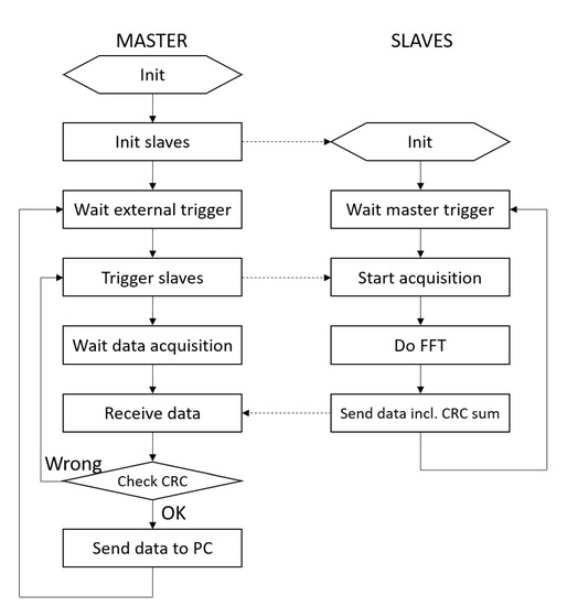 Figure 9 shows a simplified flow chart of both master and slaves operations. Once started, the master sends a set of configuration parameters (sampling frequency, number of TXs, TXs frequencies, and the bandpass parameter m) through SPI to all slaves to avoid reprogramming each slave whenever one needs to use different configurations. When the init phase has completed, the master enters a wait state until it receives an external trigger from the computer through the SCI. Immediately after, the master triggers all slaves simultaneously. Each slave uses its four independent ADCs to acquire signals on each RX. A DFT-based spectrum estimation is obtained for each RX. The maxima of its magnitude are found, and amplitudes and phases are stored in a vector. A cyclic redundancy check (CRC) [38] is applied, and the checksum is appended to the vector. After 6 ms (the fixed duration of signal acquisition and processing), the master reads through SPI the resulting vector from each slave and recalculates the checksum to verify that data have not been corrupted during transfer. If the checksum is correct, a time reference in s, to be used in the Kalman Filter, is read from an internal timer of the master MCU. All data are sent to the computer through the SCI, and finally, the master returns in its initial state, waiting for an external trigger.