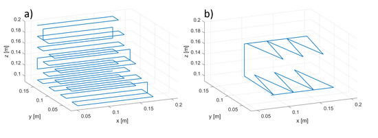 A calibration procedure is thus needed in order to set as accurately as possible all these system parameters. Each active TX is moved along a reference trajectory, i.e., over a known values of , where k indicates the time step. Then, the position and attitude of each RX, , are evaluated by minimizing the cost function: