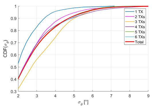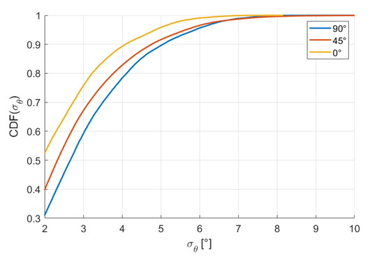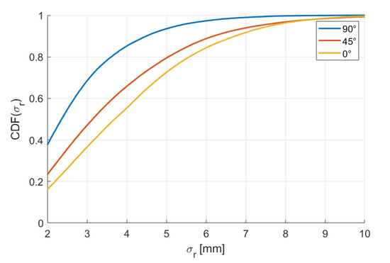 Since the arrangement of the RXs is not symmetrical (16 RXs on the plane and 4 RXs on both the and planes), we examined if the accuracy has some dependence from the attitude elevation angle. In fact, it has the best position accuracy obtained for the vertical attitude ( elevation) and the worst position accuracy for the horizontal attitude ( elevation); opposite results are obtained for the angle accuracy, the best values being obtained for the horizontal attitude and the worst being obtained for the vertical attitude. The percentiles for elevations , , and are reported in Table 5 and Table 6. The corresponding CDFs are reported in Figure 15 and Figure 16.