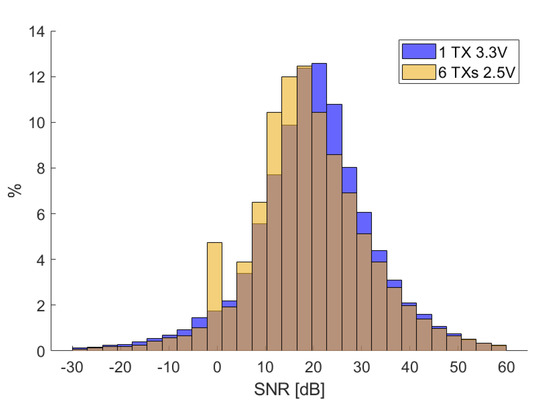 In Figure 17, we report the two distributions, and in Table 7, we report their mean and standard deviation. The SNR is not so much affected by the voltage reduction and the mutual induction between nodes; this is consistent with the position and attitude errors that do not increase too much as the system is upscaled.
