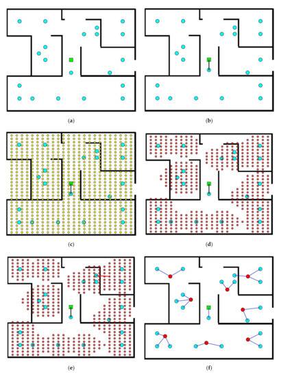 Step 1 deals with reading and storing all the data given by the user such as the dimensions of the layout, the obstacles, the EDs numbers and locations, and the BS location. In this illustrative example there are 19 EDs located at (50 m, 50 m), (150 m, 50 m), (150 m, 200 m), (400 m, 250 m), (450 m, 200 m), (50 m, 350 m), (100 m, 350 m), (200 m, 350 m), (450 m, 350 m), (450 m, 300 m), (300 m, 100 m), (350 m, 75 m), (150 m, 150 m), (350 m, 100 m), (300 m, 350 m), (50 m, 300 m), (125 m, 175 m), (450 m, 50 m), (450 m, 100 m) and (250 m, 240 m) and one BS located at (250 m, 200 m). The initial layout has a dimension of (500 m × 400 m), as shown in Figure 2a where EDs are represented by cyan colored circles whilst the BS is represented by a green-colored square. The origin (0 m, 0 m) is located in the upper left corner of the layout. Step 2 connects the EDs to the BS if they lie in close vicinity. In this example, there is one ED that can be connected directly to the BS because the distance between them is less than 55 m, as shown in Figure 2b. Consequently, in step 3, a grid of 24 × 30 = 720 potential routers is constructed over the entire floor plan, as shown in Figure 2c. Step 4 keeps only those routers that are likely to be connected to an ED and discards remaining routers from the list of potential routers, as shown in Figure 2d.