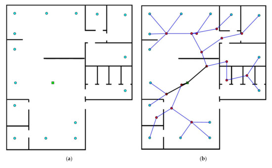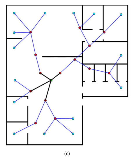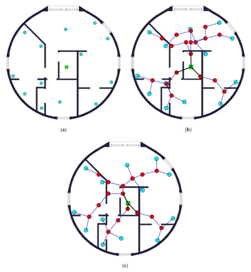The initial layout (430 m × 420 m) for this case is given in Figure 3a. There are 13 EDs and 1 BS. The synthesized network using the fully automatized CAD tool is given in Figure 3b while the one obtained using the proposed approach is given in Figure 3c. It can be seen from these figures that, for the first network, there are 18 placed routers whilst for the second network, there are 16 placed routers. It can also be noticed that the synthesized network using the proposed approach is much more optimized than the one using the CAD tool without the interaction of the expert designer.