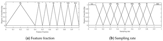The results of extensive experiments show that the quality of BCS-SPL reconstruction can be improved by adjusting , which is a constant that controls the convergence speed. During our performance evaluation, we also found that the optimal value of depends on the feature fraction in Equation (6) and the sampling rate. As a result, we developed an FLS to determine the best value for a specific image and sampling rate. Our FLS has 2 fuzzy input variables, the first of which is the feature fraction, which can take 7 linguistic values (Extremely Low (XL), Very Low, Low, Medium, High, Very High, and Extremely High (XH)). A trapezoidal membership function is applied to all these values.