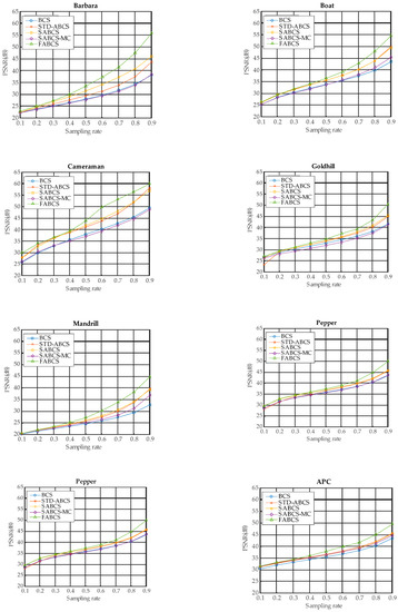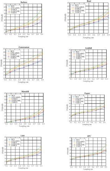 44]) for all the ABCS algorithms (32 × 32 block size) used in this study at various sampling rates (e.g., 0.1, 0.3 and 0.5). At low sampling rates, a limited number of samplings exist for ABCS; therefore, most of the information is lost. Consequently, the distortion rate of the reconstructed images is high. As the sampling rate increases, the quality of the reconstructed images improves.