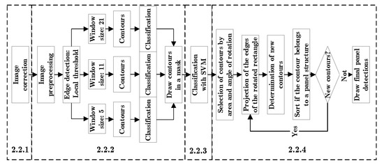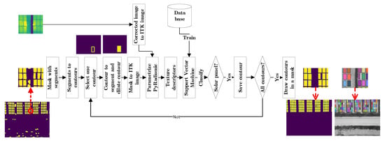 The determination of new contours and their classification is based on the premise that the panels have a homogeneous shape, are grouped and can be classified by texture descriptors. So, the contours are calculated from the matrix of zeros with the lines drawn. The contours are classified in different steps: first the contours with an area deviating less than 30% from the average area are selected. Second, contours that do not overlap with the detected panels are selected. Third, they are classified according to whether they belong to the panel structure or not. If they cannot be associated with the structure, they are classified using a support vector machine (see Section 2.2.3) (Figure 7).