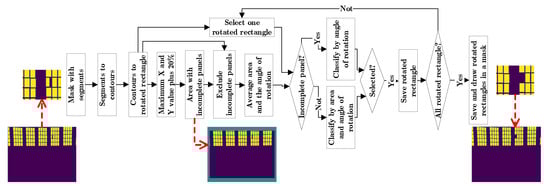 The selection of the contours of the detected panels is based on the following premises: the solar panels have four sides, the edges of the image have cut-out panels and most of the contours are solar panels. Therefore, each contour can be simplified to a rotated rectangle and the coordinates of the image where there are incomplete panels are related to the coordinates of the rotated rectangle. The rotated rectangle is composed of four points in the image, these points are represented by X and Y coordinates. The maximum X and Y shift value between points of each rotated rectangle is calculated and stored in a matrix. Finally, the section of the image border with incomplete panels, is calculated from the maximum value of the matrix of displacements in X and Y, plus a 20%. It is assumed that the region where there are incomplete panels is a rectangle with an edge shift towards the center with the maximum X value for vertical edges and the maximum Y value for horizontal edges. Thus, excluding the panels at the edges, the average area and the angle of rotation of the rotated rectangles are calculated. For the panels at the edges only the angle of rotation of the contour is calculated. Because images suffer from lens and perspective distortions, the contours with a 20% deviation from the rotation angle and a deviation of 20% below and 30% above the average area are eliminated (Figure 6).