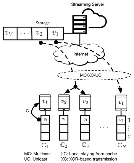 A recent study showed that the total amount of Internet traffic will increase three-fold over five years from 2017 to 2022, and video traffic would be growing more sharply than other types of traffic [1]. More specifically, it was predicted that the video traffic that accounted for about 75% of total Internet traffic in 2017 would increase to about 82% in 2022. It was also revealed by another interesting study that the most popular 50 videos accounted for almost 80% of the total number of views in a major over-the-top (OTT) service provider, YouTube [2]. Video service providers deploy huge content delivery systems and manage their own systems to meet the increasing demand, but the approach causes a tremendous cost to the companies [3]. An alternative is to use caching [4,5]. If a requested content exists in the cache of a nearby proxy server, clients can receive the cached copy, which typically reduces delivery time. Recently, the concept of caching has been extended to wireless multimedia streaming systems to cope with the sharply increasing data traffic by offloading increasing video traffic or improving the spectral efficiency of wireless networks [6,7,8,9,10,11,12,13,14,15]. The problem of caching placement was investigated, and some state-of-the-art solutions were introduced in [6,7,8,9]. A dynamic deep reinforcement learning-based management framework for virtual cache slicing was proposed to manage the limited cache resources when service providers share a common physical infrastructure [6]. A probabilistic caching placement was investigated to control cache-based channel selection diversity and network interference in a stochastic wireless caching helper network [7]. A tradeoff between the content diversity gain and the cooperative gain according to content placements was investigated and a probabilistic content placement to optimally balance the tradeoff was proposed [8]. Device-to-device (D2D) caching network, where each node caches some contents and another node can receive these contents directly from its nearby nodes instead of a remote service provider, was investigated in [10,11].
