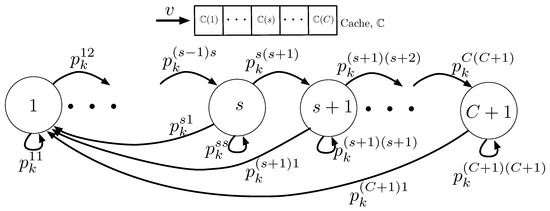 A certain content might be stored in the client’s cache or might not be stored. In the case that content k is stored in the cache, the content k can have C states based on its stored location. Thus, each content k can have total states in . The -th state denotes that the content is not stored in the cache. The behavior of content k in the cache can be modeled by a Markov chain, as depicted in Figure 2. Transition probability denotes a probability that a content k staying at state s moves to state j after a client plays the content v.