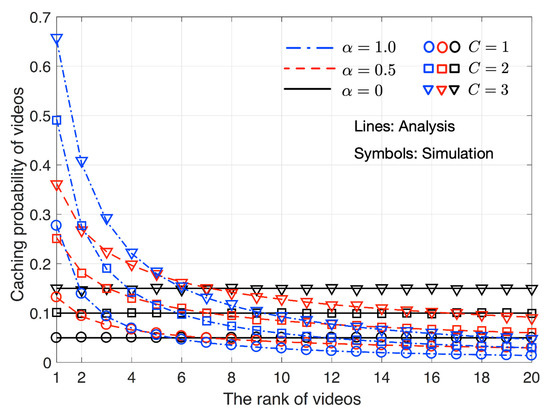 Figure 3 shows probabilities ’s for various k values, , , and . For , ’s are the same as normalized popularity values given by Zipf distribution because the current content stored in a cache is the content that a client requested according to Zipf distribution. As C increases, all ’s increase regardless of the ranks of contents, k. As explained in (3), makes all contents have the same popularity and ’s are thus all the same for all k’s. As increases, ’s of upper rank contents increases while ’s of lower rank contents decrease.