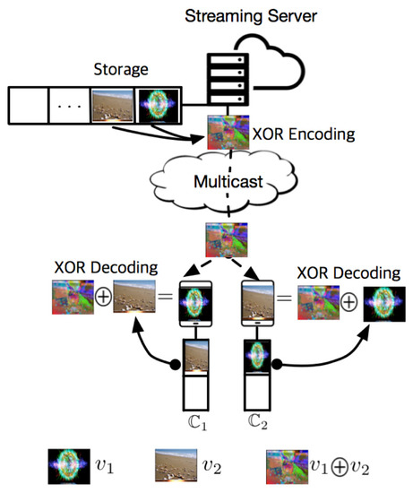 The XOR operation has the zero-identity, by which is satisfied for a given bit stream , where is the bit stream consisting of 0 and it has the same length as . It also has the property of self-inverse satisfying . In addition, XOR is not only commutative, but also associative. Figure 4 illustrates a simplified concept of XC which is a video streaming scheme using XOR coding based on the four aforementioned properties. Client 1 wants to stream with cached in , and client 2 wants to stream with cached in . Contrary to a conventional scheme where a streaming server transmits and by UC using two separate connections, XC generates the coded bit stream and transmits it by using a single connection. Then, client 1 and 2 reconstruct and from by using their cached data as