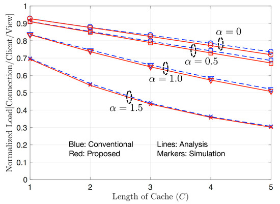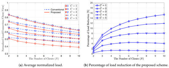 Please note that is always satisfied because and is only valid when . We define the average normalized load as the average number of required connections per each client’s video view, which is denoted by and can be calculated for the proposed and conventional schemes, respectively, as