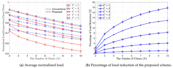 In Figure 6, we compare the performance of the proposed scheme to the conventional scheme according to the number of clients, N. Figure 6a shows the average normalized load of the proposed and conventional schemes by varying N from 2 to 10 when , and . Here, means that Zipf distribution become Uniform distribution and all video contents thus have the same popularity. As N increases, the frequency of using MC for the conventional scheme and the frequency of using MC or XC for the proposed scheme both increase. Thus, the average normalized load decreases with an increasing N for both the proposed and conventional schemes, as predicted in Figure 5. In addition, the average load also decreases with an increasing C because the frequency of using LC for the conventional scheme and the frequency of using LC or XC for the proposed scheme both increase as C increases. Figure 6b shows how much the proposed scheme can reduce the average normalized load by using XC, compared to the conventional scheme. The percentage of average load reduction by the proposed scheme is calculated as . In this figure, we can observe that for all N and C values, the proposed scheme outperforms the conventional scheme due to the gain obtained from XC, and thus . The frequency of using XC in the proposed scheme increases as N or C increases and thus, increases with increasing N or C. As a specific example with and , the proposed scheme can reduce the average load about , compared to the conventional scheme.